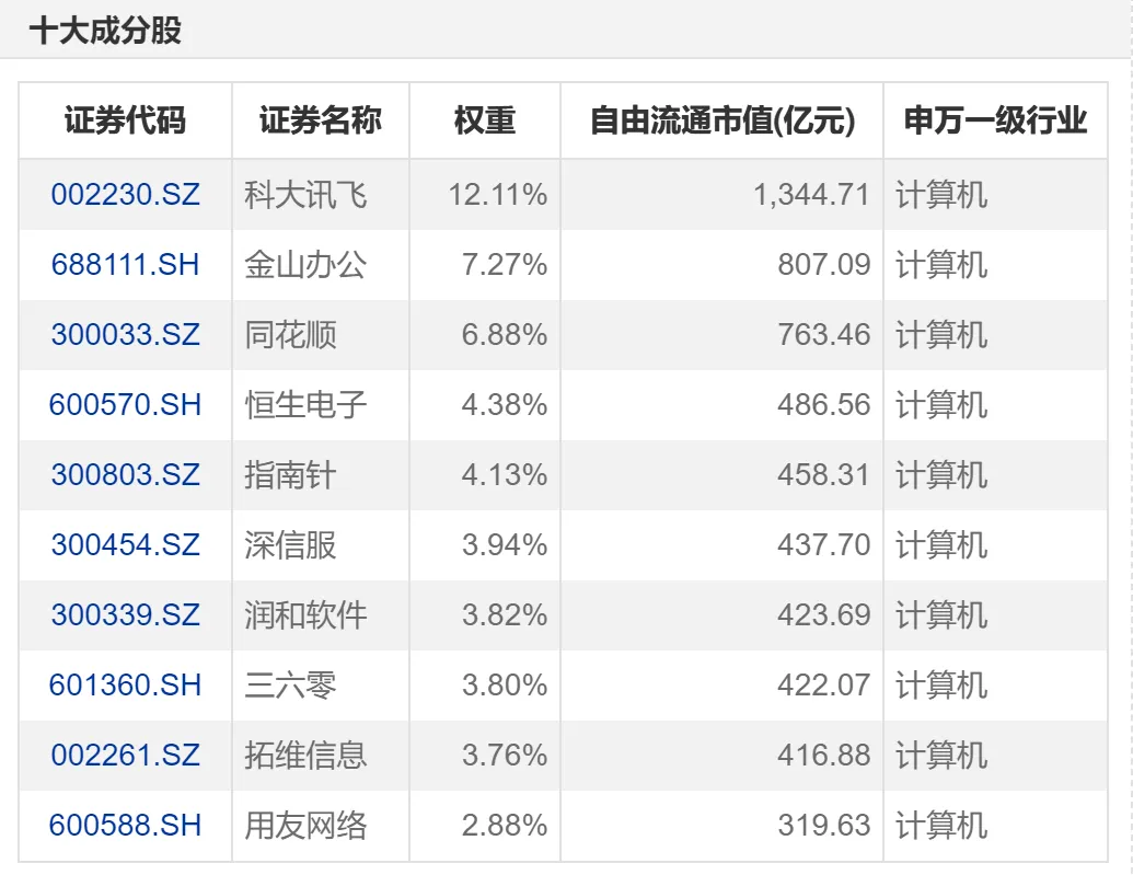 软件龙头ETF(159899)跟踪的就是中证全指软件指数,主要涵盖基础软件、应用软件、网络安全等领域细分公司,指数前十大成份股覆盖了科大讯飞、金山办公、同花顺、恒生电子、指南针等龙头公司。