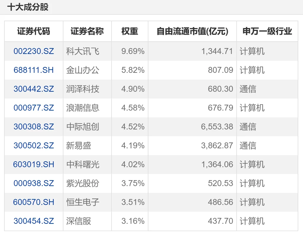 云计算ETF(159890)跟踪的是中证云计算与大数据主题指数,包含了计算机软件、云服务、计算机设备、通信设备等环节,前十大成分股除了科大讯飞、金山办公等软件龙头之外,还有中际旭创、新易盛等通讯龙头,对AI应用和信创方向都进行了覆盖,范围更广。