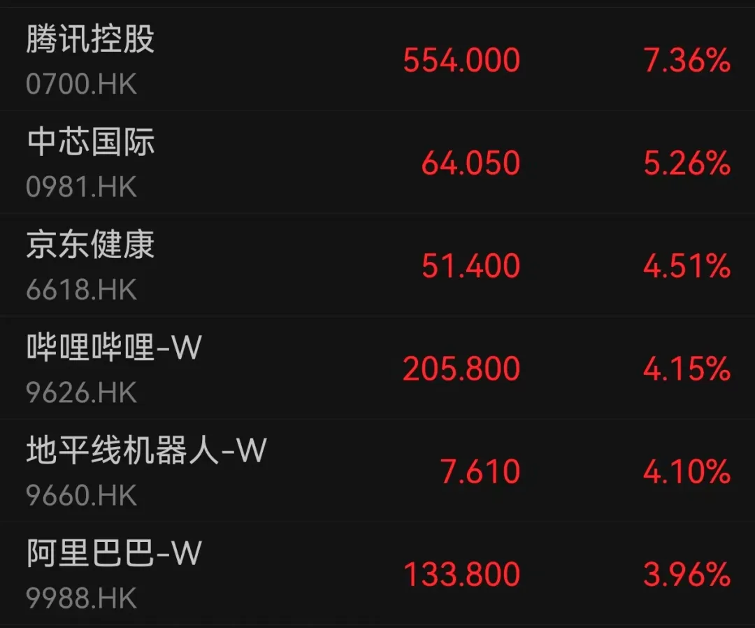 利好刺激之下,腾讯控股早盘股价大涨,总市值一度突破5万亿港元,并带动其它科技股上涨。