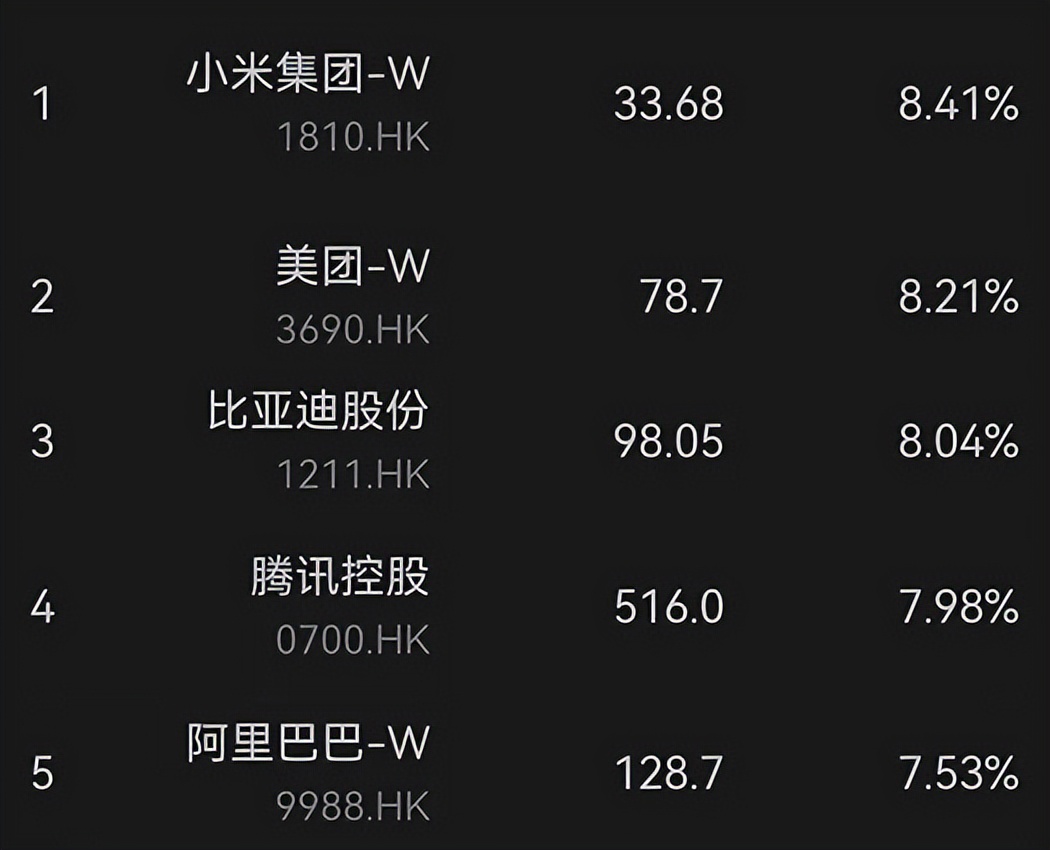 指数前五大权重股中,腾讯控股市盈率(TTM)20.87倍,阿里巴巴-W 18.46倍,小米集团-W 18.05倍,比亚迪股份20.94倍。