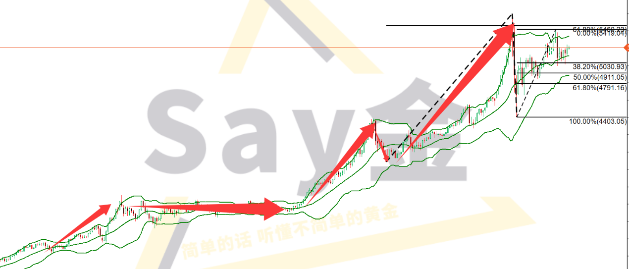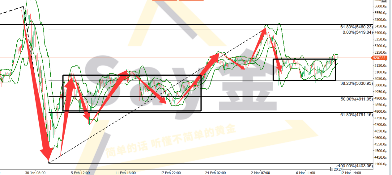技术面上,一小时周期看得很清楚:这一波上涨,不仅仅是抬价,而是把核心支撑位也在往上移。布林带从缩口到张口,再到缩口、张口,节奏完全被多头拿捏。价格稳在中轨和上轨之间,维持在强势区间运行。就算5200突破之后有调整,也是中轨撑住,根本不给下轨机会——这说明什么?涨势没完。