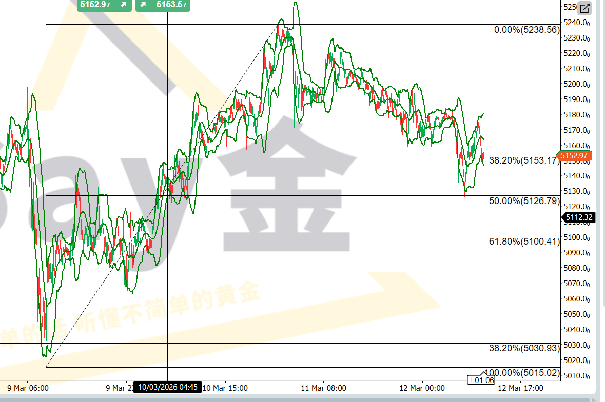 按上涨幅度测算一下:这一波从低点上来,已经拉了40美金左右。如果重新起算,这一波至少能看到5190。5190这个位置有意思,正好是昨天晚上的高点区域,也是均线压制位。昨天数据出来之后,几次摸5200都被拍下来,最后还是跌了。所以如果今天能打到5190,先看看反应,但从交易角度来说,这个位置就是最好的短线离场点。