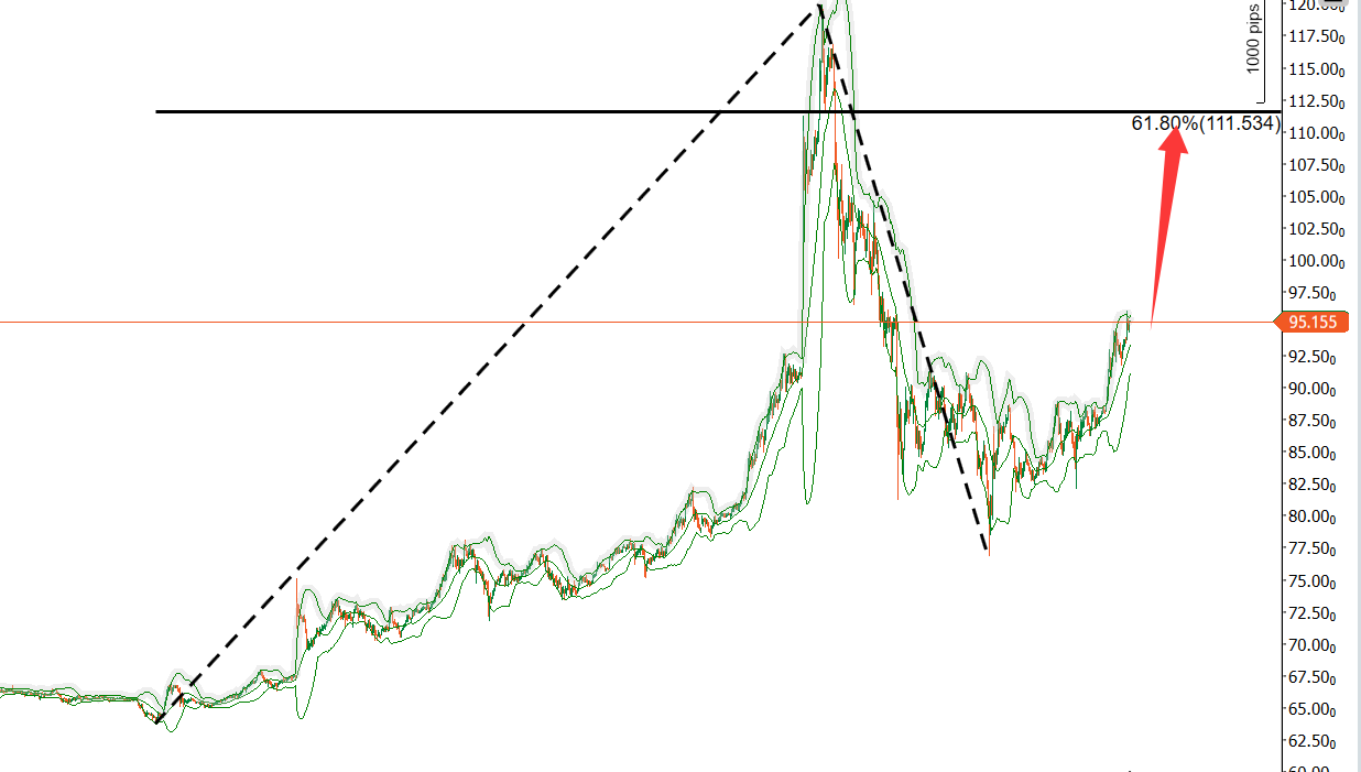 再顺带提一嘴原油。为啥昨天黄金跌?一个很重要的原因就是原油又拉了一波。但基本面看,这事儿差不多该收尾了,最激烈的那一段快过去了。如果真的开始谈判,那原油的顶也就快到了。但从技术面看,原油可能还得再冲一波,按斐波那契扩展线算,可能得摸一下111(口误)这个位置。