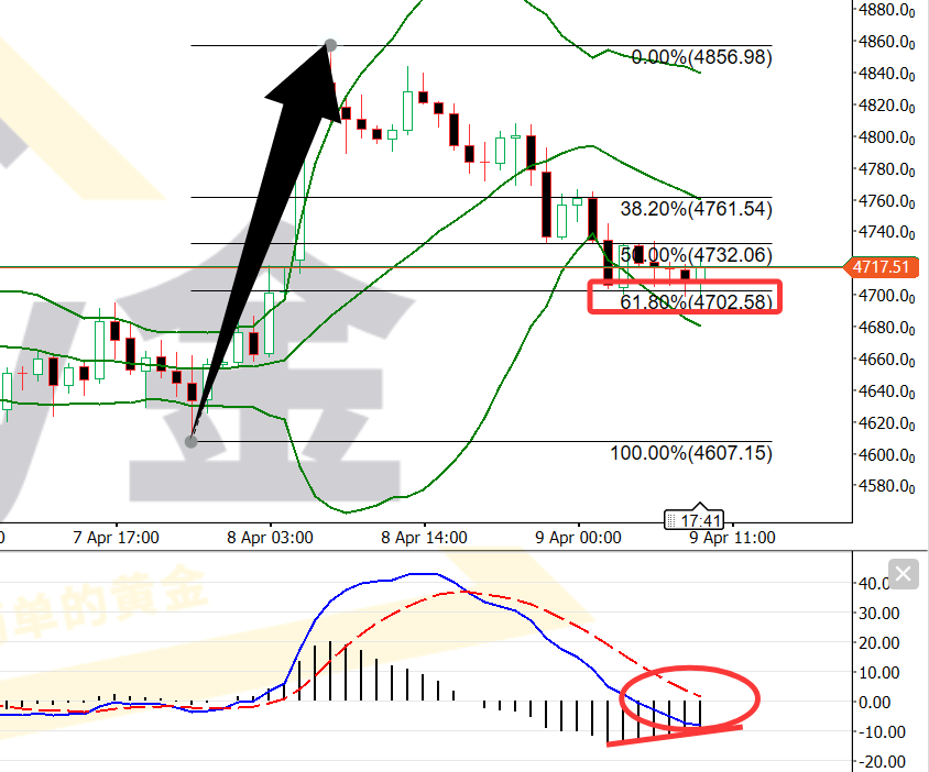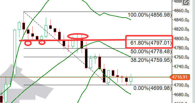 那今早看到黄金给到4700的价格后,我其实挺开心的,提前跌总比攥着劲在周五晚上一起跌更好。所以,今天,我更想看到的是黄金下跌的延续性,但是,从技术面看,当下的黄金多少有点触底的意思,所以,黄金就算是延续下跌,也只能出现在反弹之后。反弹的话就要根据起跌点和当下的低点来测算了,如下图所示: