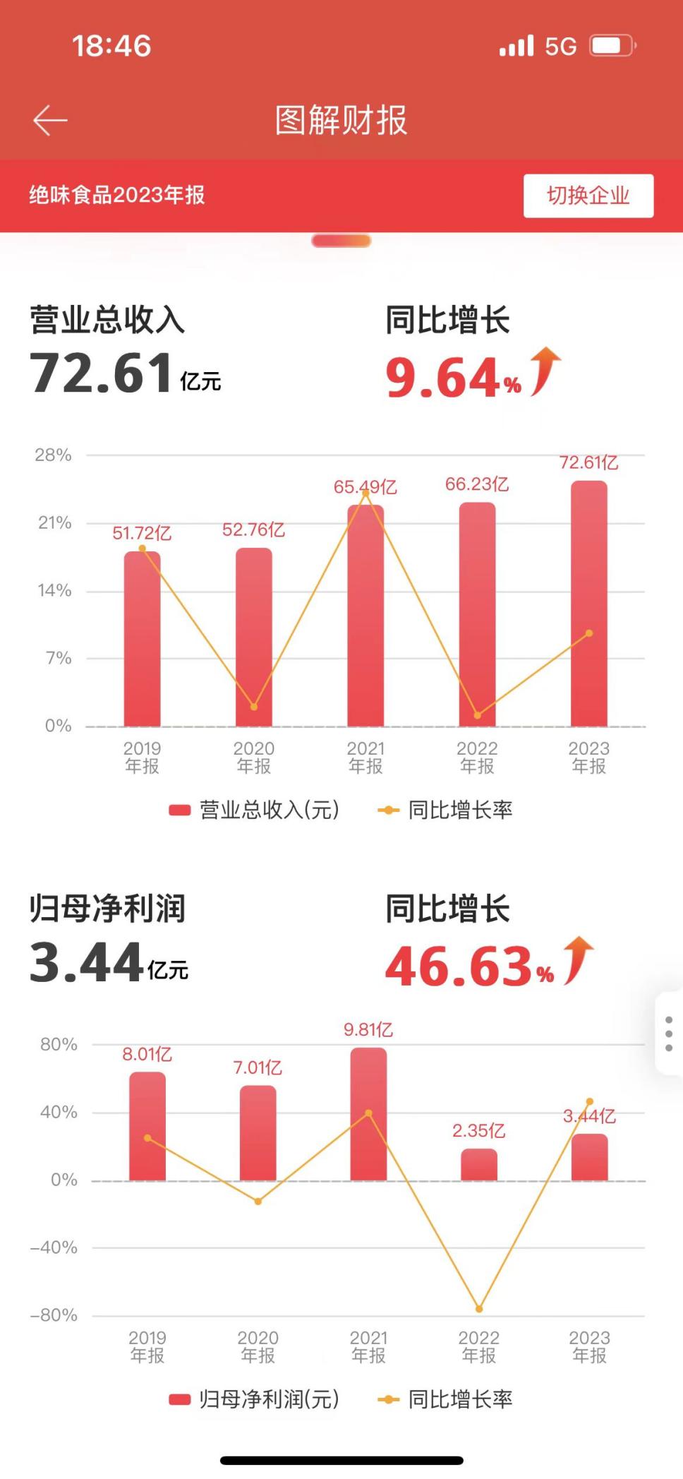 4月29日晚间,绝味食品(603517.SH)发布2023年度业绩报告,全年实现营业收入72.61亿元,同比增长9.64%;归母净利润3.44亿元,同比增长46.63%。公司拟向全体股东每10股派发现金股利人民币5.00元(含税)。