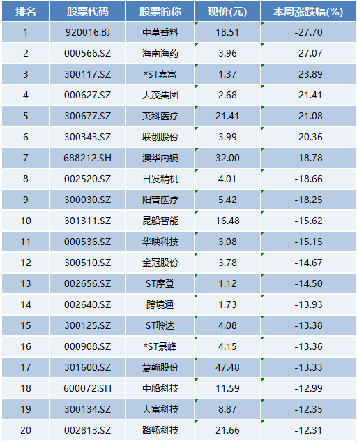 本周排在跌幅榜前十名的分别是中草香料、海南海药、*ST嘉寓、天茂集团、英科医疗、联创股份、澳华内镜、日发精机、阳普医疗、昆船智能。