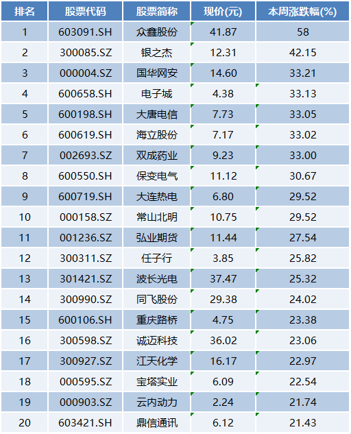 iFinD数据显示,本周排在上市公司涨幅榜前十名的分别是众鑫股份、银之杰、国华网安、电子城、大唐电信、海立股份、双成药业、保变电气、大连热电、常山北明。