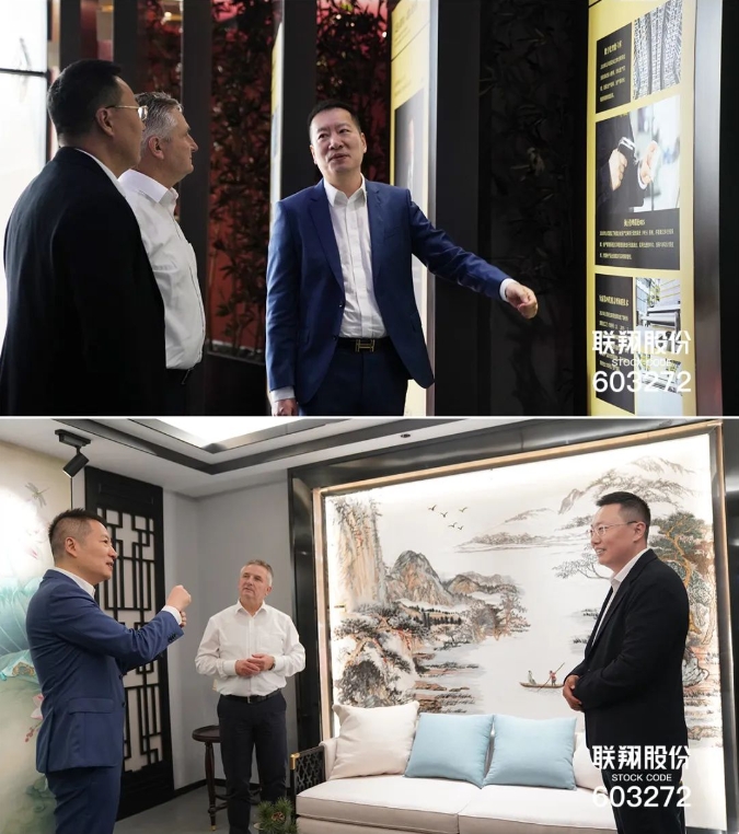 在联翔股份董事长兼总经理卜晓华先生、窗帘业务负责人闻建美女士及公司领导团队的陪同下,盖格集团代表团一行首先参观了公司的展厅。通过对公司墙布、窗帘产品的展示,生动展现了联翔股份在行业内的深厚底蕴与创新实力,激发了盖格集团代表们的浓厚兴趣。