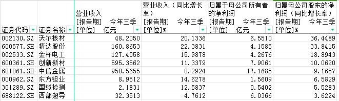 从业绩表现看,今年前三季度,营业收入和归母净利润均实现同比增长的只有8家上市公司,分别是沃尔核材、精达股份、金杯电工、创新新材、中信金属、东方钽业、国缆检测、西部超导。