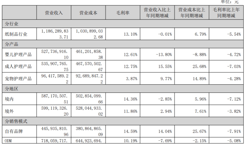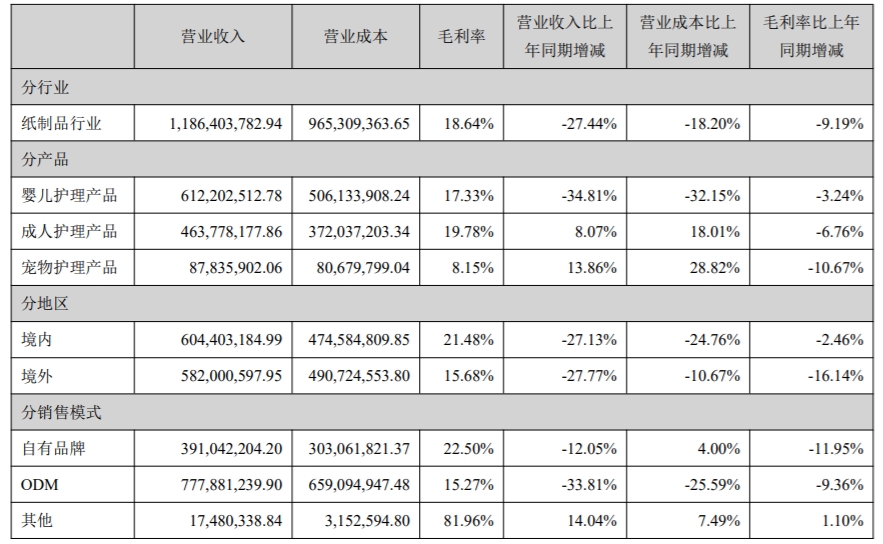 其中,婴儿护理产品毛利率为17.33%,同比下降3.24%;成人护理产品毛利率为19.78%,同比下降6.67%;宠物护理产品毛利率为8.15%,同比下降10.67%;境内销售毛利率为21.48%,同比下降2.46%;境外销售毛利率为15.68%,同比下降16.14%。