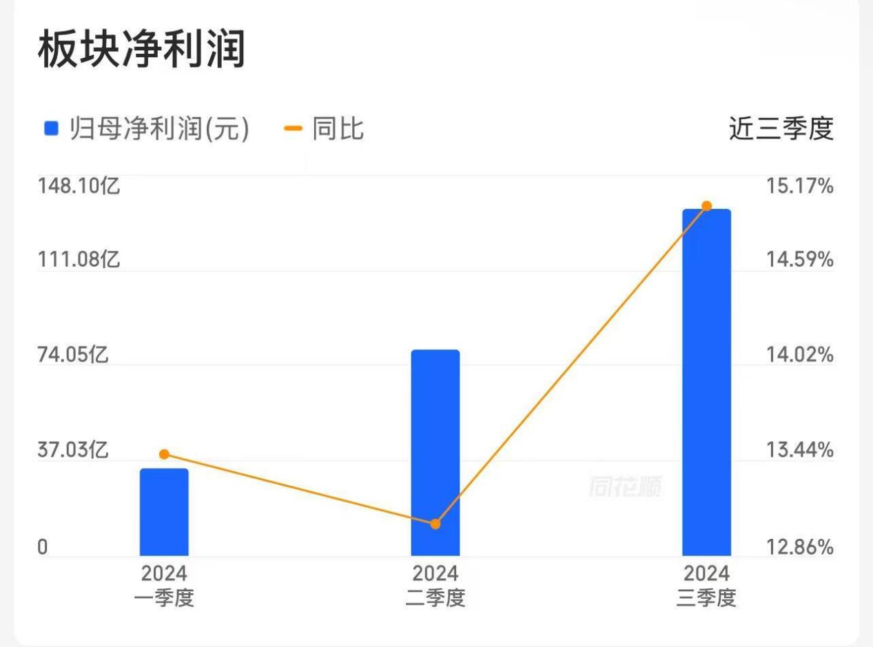 近5日以来,板块涨幅15.17%,33个成分股全部实现上涨;板块净利润134.64亿元,同比上涨14.98%。