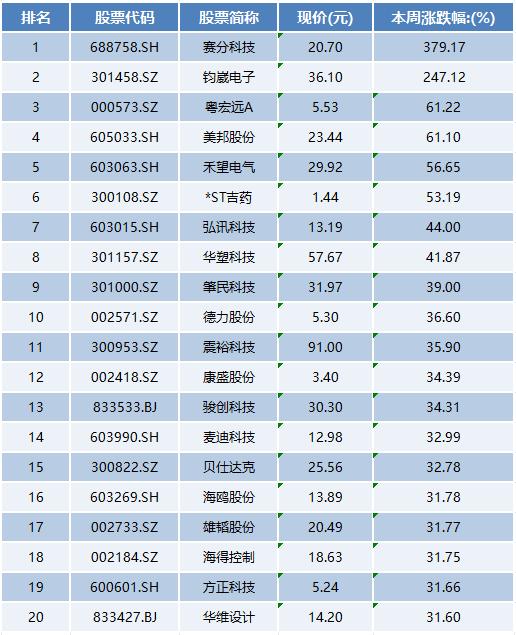 iFinD数据显示,本周排在上市公司涨幅榜前十名的分别是赛分科技、钧崴电子、粤宏远A、美邦股份、禾望电气、*ST吉药、弘讯科技、华塑科技、肇民科技、德力股份。涨幅榜靠前的个股大多集中在AI和机器人等概念中,市场还是对科技板块更加青睐。
