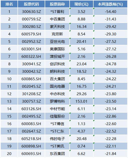 本周排在跌幅榜前十名的分别是*ST普利、中百集团、紫天科技、克劳斯、亚世光电、奥康国际、津投城开、创识科技、朗科科技、百大集团。上涨表现强势的新零售板块,本周迎来调整,多只个股跌幅居前。