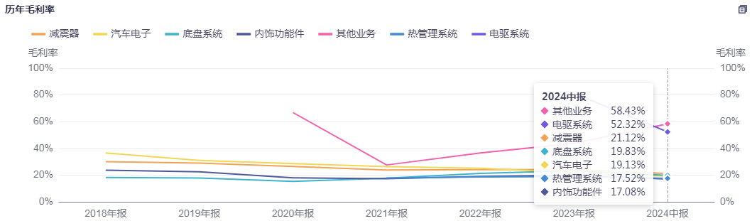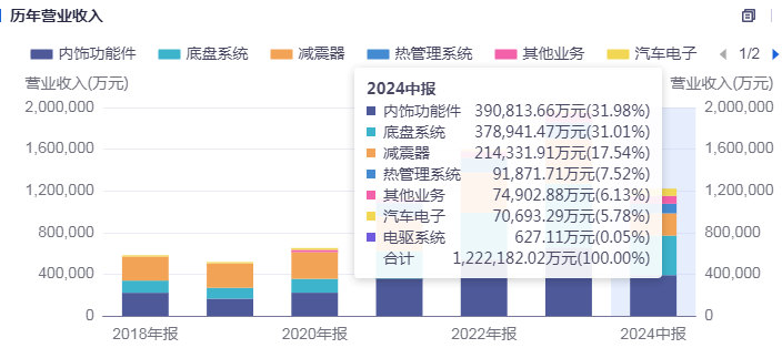 从产品对业绩的贡献来看,减震器和内饰功能件属于成熟类产品,也是公司业务基石。两类产品营收占比超50%,其中减震器的市场份额目前位列国内市场第一、全球第三。
