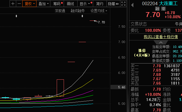 截至发稿,大连重工涨10%,报7.70元/股,近4个交易日累计上涨46.67%。