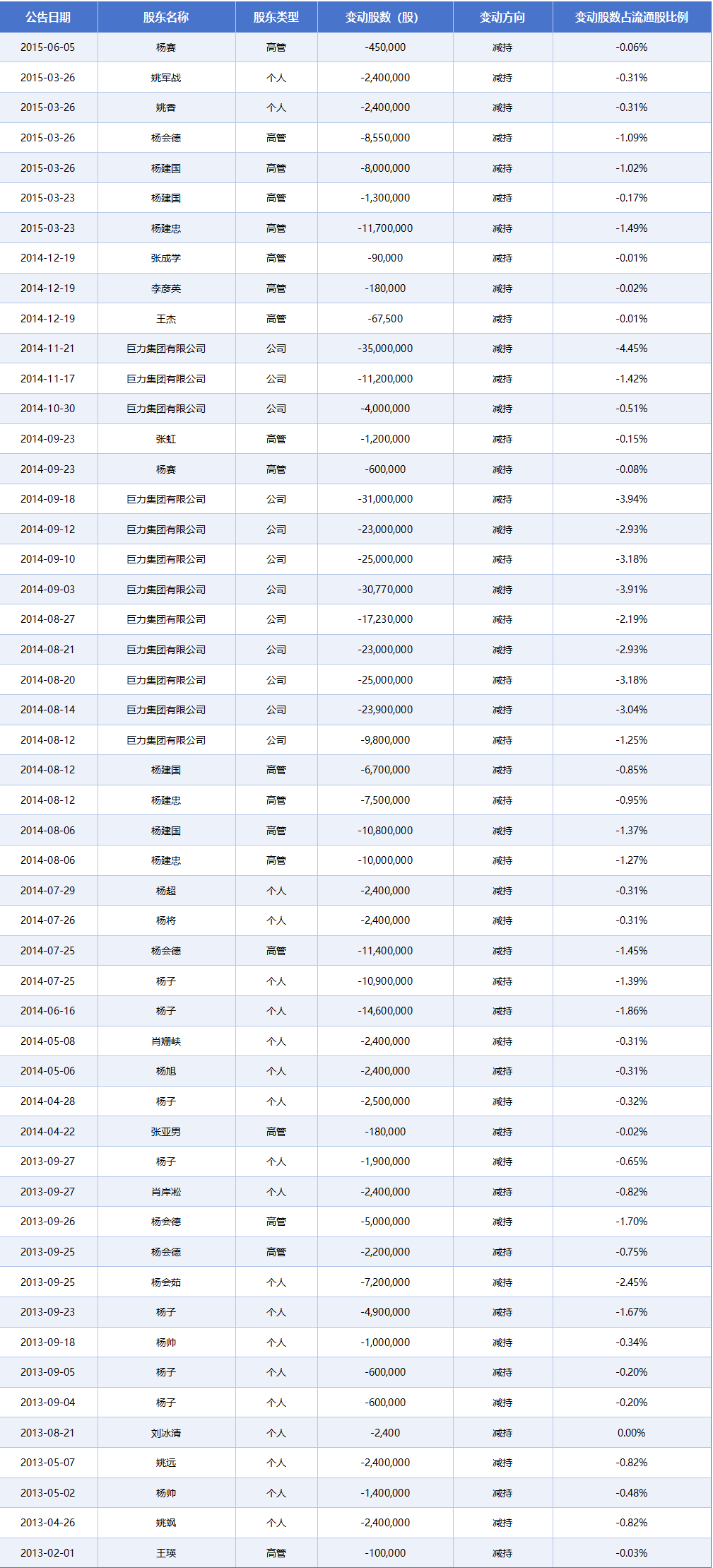 然而,2013年限售期一过,杨氏家族成员就开启了疯狂减持套现模式。粗略计算,在2013—2015年杨氏家族直接或间接减持巨力索具股份次数近50次,累计套现金额几十亿。