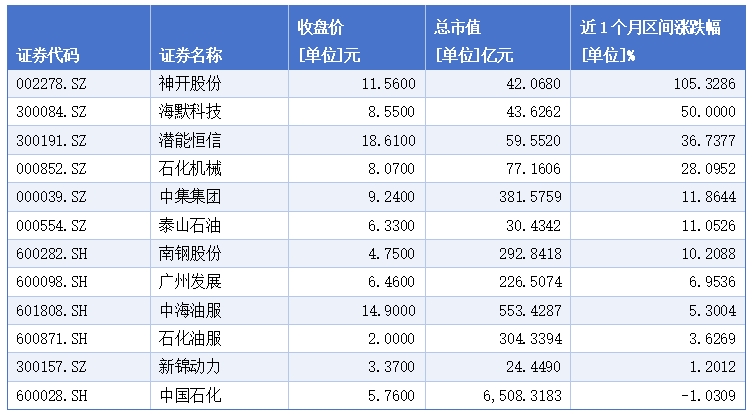 同花顺数据显示,截至3月26日收盘,A股可燃冰概念板块一共有12只概念股。从近一个月表现看,除中国石化之外,神开股份、海默科技、潜能恒信、石化机械、中集集团、泰山石油、南钢股份、广州发展、中海油服、石化油服、新锦动力11个股均实现上涨。