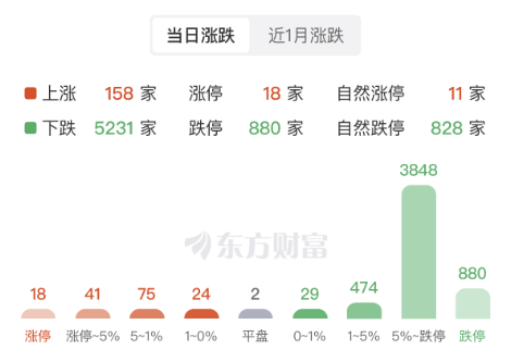 个股方面,截至10:15,A股市场上涨仅158家,下跌家数超5200家,跌停家数高达880家。