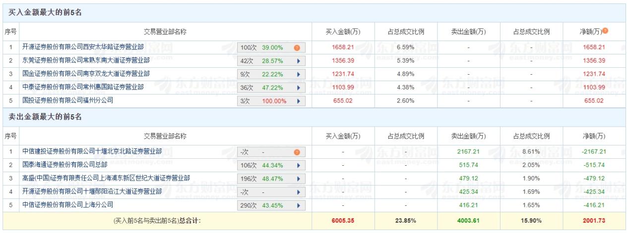 买入席位中,开源证券股份有限公司西安太华路证券营业部买入1658.21万元,东莞证券常熟东南大道买入1356.39万元,国金证券南京双龙大道买入1231.74万元,中泰证券股份有限公司常州惠国路证券营业部买入1103.99万元,国投证券福州分公司买入655.02万元。