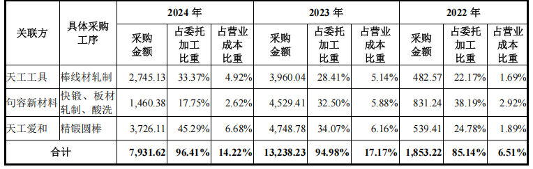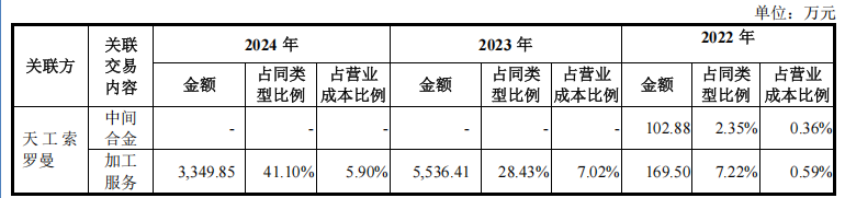 2022年—2024年,天工股份与关联方存在采购、销售、租赁等关联交易情形,公司从关联公司经常性关联采购金额分别为2147.89万元、1.67亿元及8903.1万元,占当期营业成本比例分别为7.54%、21.70%和15.96%。