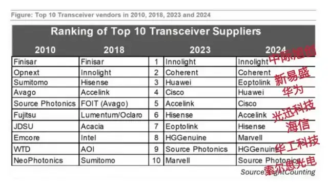 近期,国际知名光通信行业研究机构LightCounting最新发布的2024年全球光模块TOP10榜单显示,中国厂商占据7个席位,已在该领域占据主导地位。在全球范围内新易盛排名第3,在中国范围内新易盛排名第2。而在2023年,新易盛还只处在全球第7,中国第5的位置,仅用一年时间,新易盛就超过了华为、光迅科技、海信等实力企业。