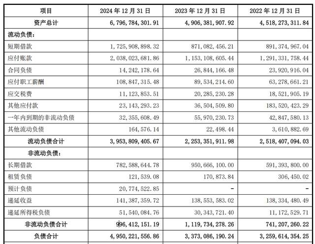 超颖电子有多缺钱?债务结构显示,2024年其短期借款激增至17.26亿元,2023年该数额还只有8.71亿元,同比翻倍;应付账款达20.38亿元,占流动负债近50%。公司流动负债与非流动负债总计高达49.50亿元,账面货币资金仅5.65亿元。