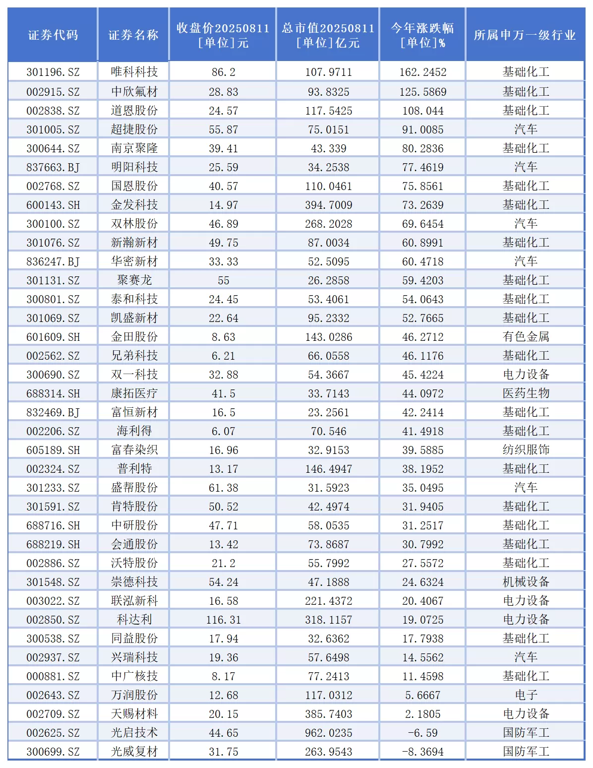 其中,唯科科技、中欣氟材、道恩股份3家上市公司成功实现翻倍,位列前三。