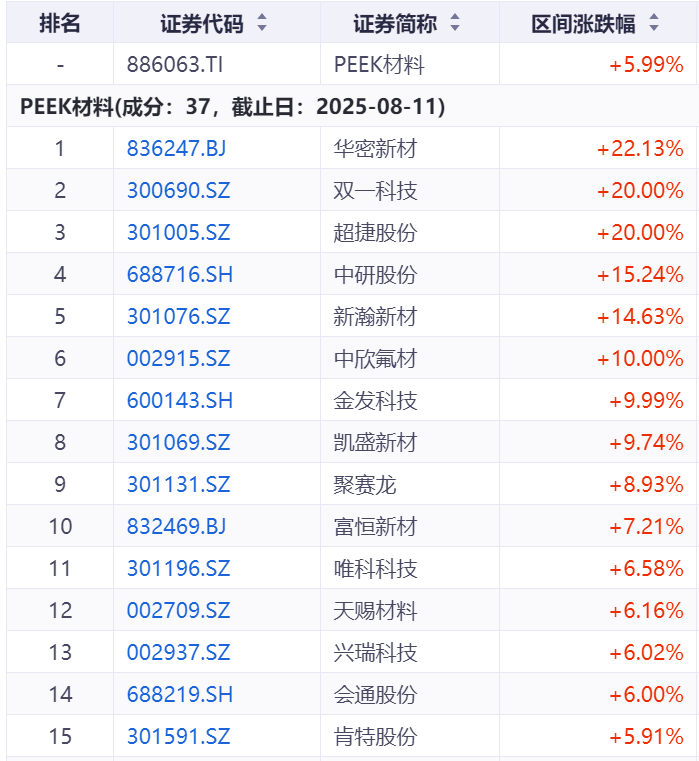 8月11日,PEEK材料概念持续走强。截至收盘,中欣氟材(002915.SZ)收获5天4板,华密新材(836247.BJ)涨超20%,双一科技(300690.SZ)20CM涨停,中研股份(688716.SH)、新瀚新材(301076.SZ)涨超10%,富恒新材(832469.BJ)、唯科科技(301196.SZ)等跟涨。