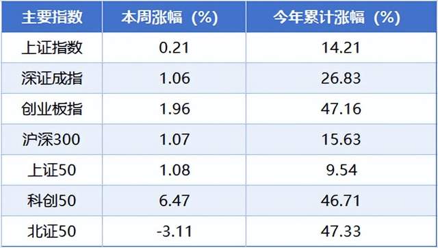 指数层面,本周A股主要指数多以红盘报收,仅北证50指数出现回调。其中,科创50指数以6.47%的涨幅居首,今年以来累计上涨46.71%;创业板指本周上涨1.96%,今年累计涨幅达到47.16%。此外,上证50、沪深300、深证成指本周累计涨幅均超1%。