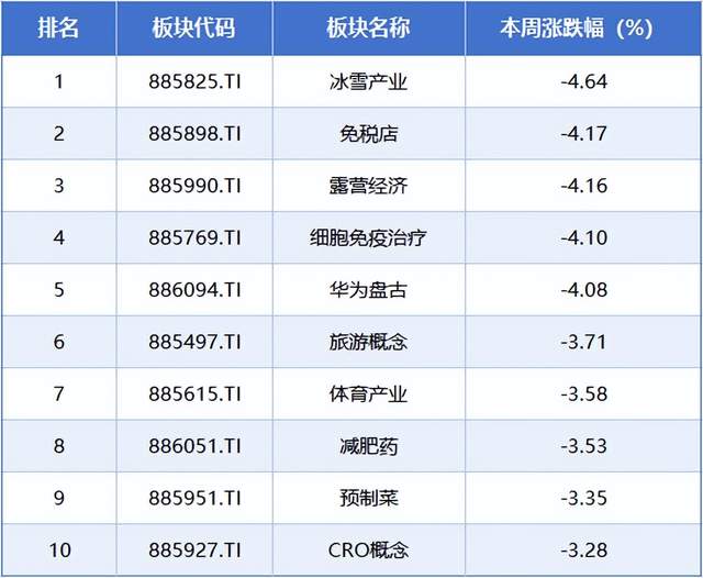 本周排在跌幅榜前排的概念板块分别是冰雪产业、免税店、露营经济、细胞免疫治疗、华为盘古,累计跌幅分别为4.64%、4.17%、4.16%、4.10%、4.08%。