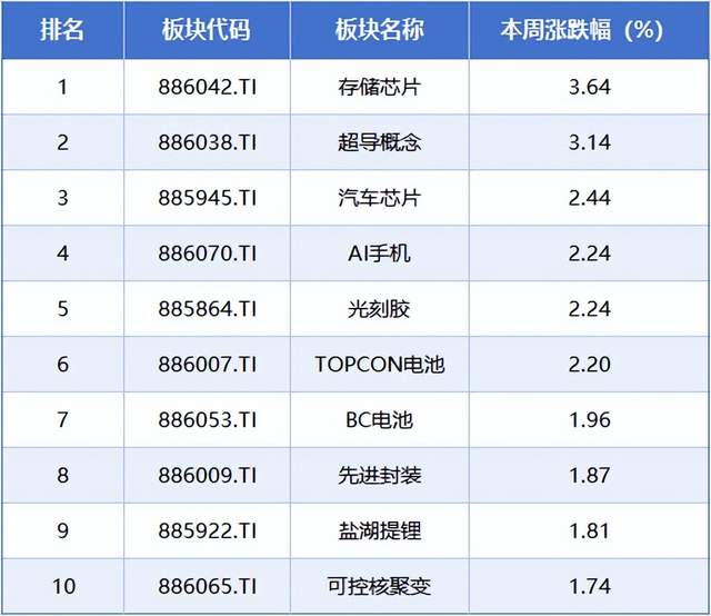 板块方面,本周涨幅居前的概念板块分别是存储芯片、超导概念、汽车芯片、AI手机、光刻胶,累计涨幅分别为3.64%、3.14%、2.44%、2.24%、2.24%。
