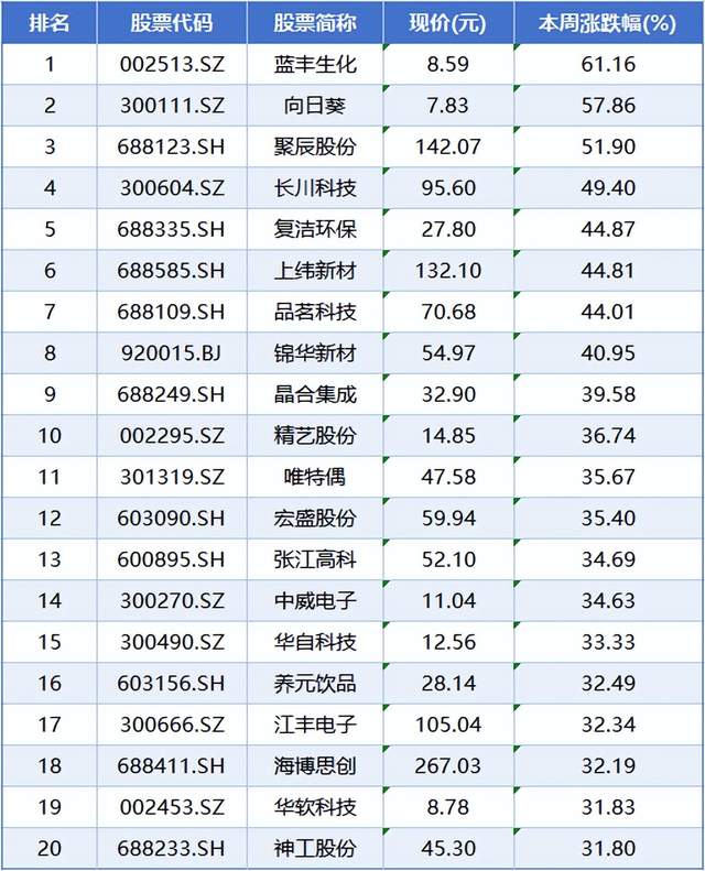 个股方面,本周个股涨幅榜前五位分别是蓝丰生化、向日葵、聚辰股份、长川科技、复洁环保,累计涨幅分别为61.16%、57.86%、51.90%、49.40%、44.87%。