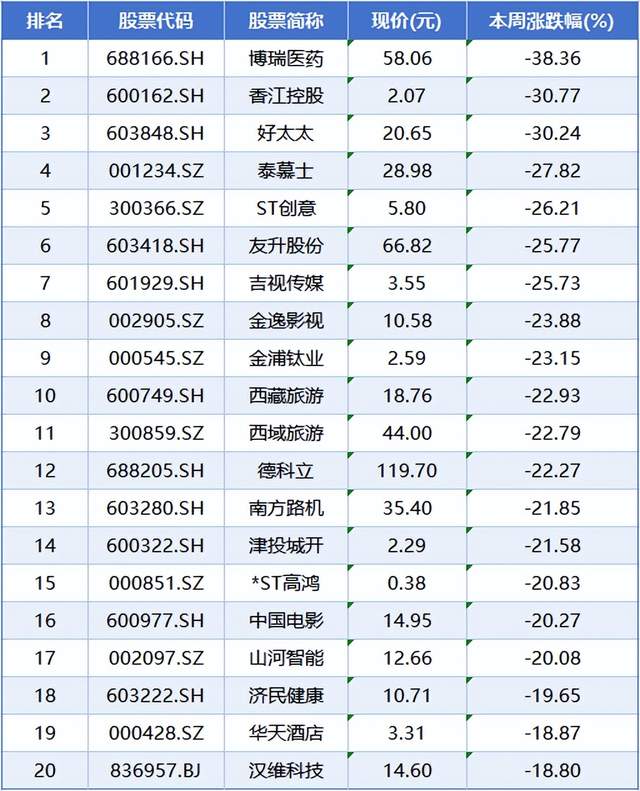 本周个股跌幅榜前五位分别是博瑞医药、香江控股、好太太、泰慕士、ST创意,累计跌幅分别为38.36%、30.77%、30.24%、27.82%、26.21%。