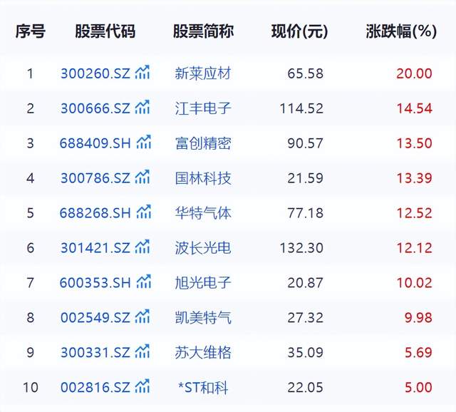 截至收盘,新莱应材(300260.SZ)、旭光电子(600353.SH)、凯美特气(002549.SZ)涨停,江丰电子(300666.SZ)、国林科技(300786.SZ)、华特气体(688268.SH)涨超10%,苏大维格(300331.SZ)、*ST和科(002816.SZ)等纷纷跟涨。