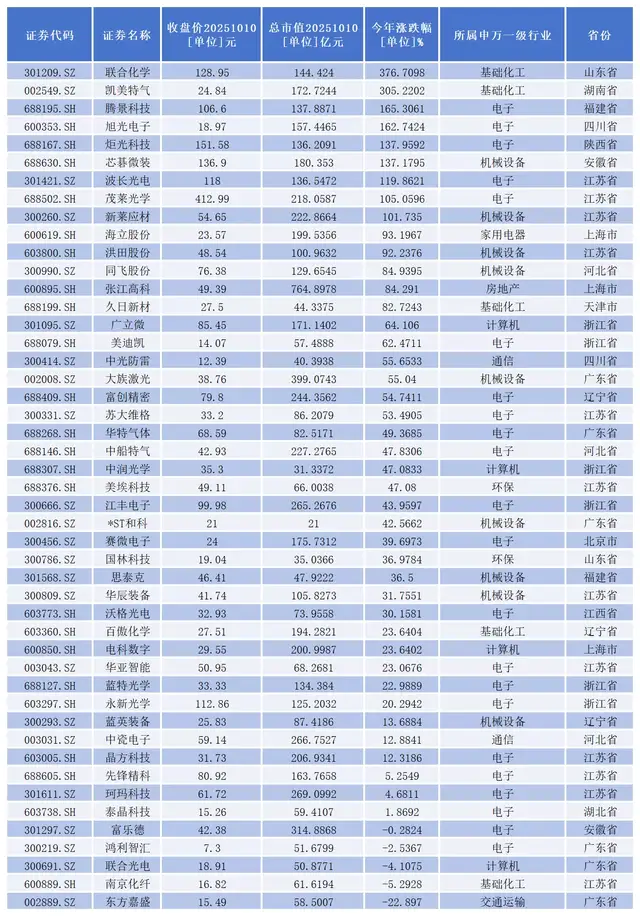 其中,联合化学(301209.SZ)、凯美特气(002549.SZ)、腾景科技(688195.SH)、旭光电子(600353.SH)、炬光科技(688167.SH)、芯碁微装(688630.SH)、波长光电(301421.SZ)、茂莱光学(688502.SH)新莱应材(300260.SZ)9家公司股价成功实现翻倍。