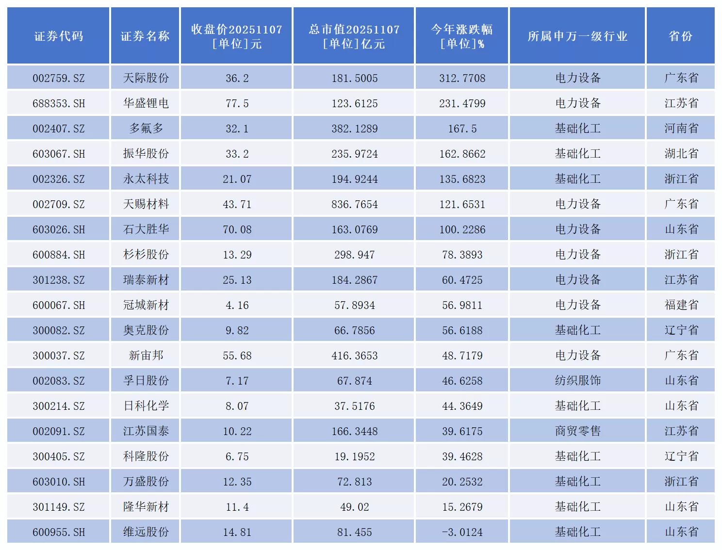 同花顺数据显示,目前A股电解液板块一共有19家上市公司。从二级市场表现看,今年以来,截至11月7日收盘,18家公司股价出现上涨。