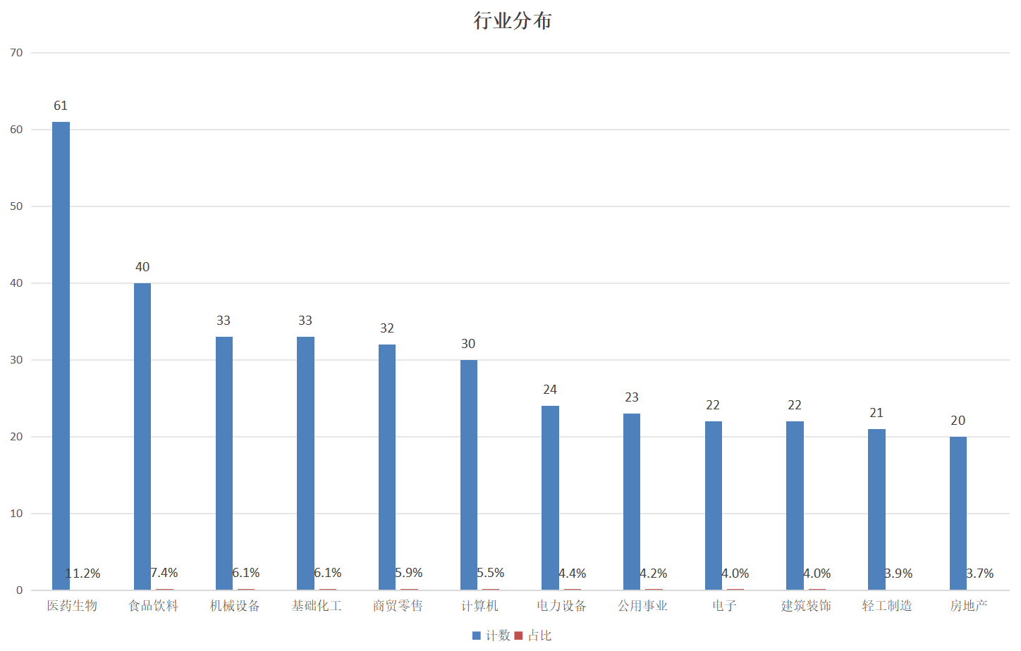 从行业分布看,根据申万一级行业分类,在这544家上市公司中,来自生物医药行业的有61家,占比11.2%;其次是食品饮料行业,有40家,占比7.4%;机械设备、基础化工各有33家,并列第三。
