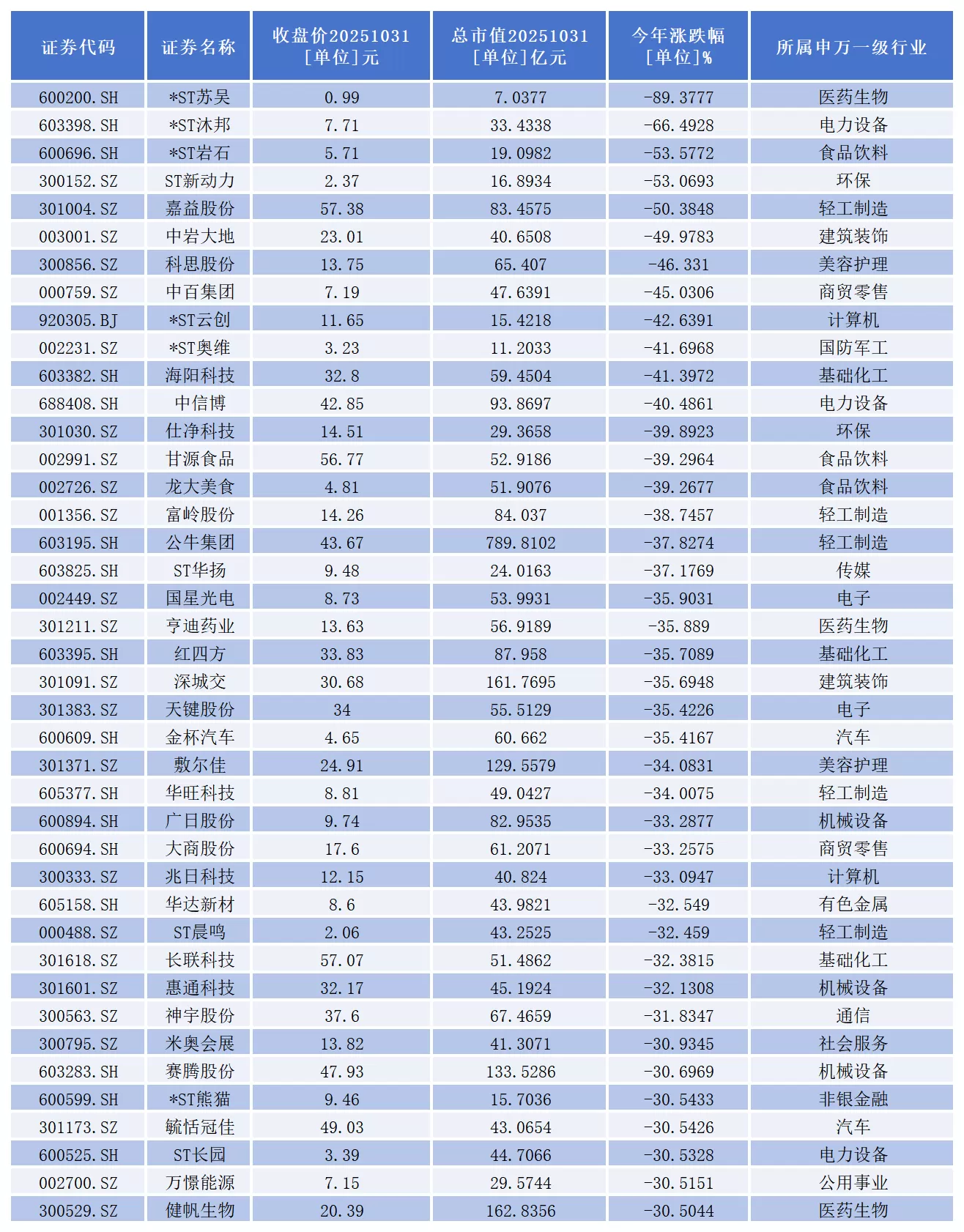 其中,*ST苏吴(600200.SH)、*ST沐邦(603398.SH)、*ST岩石(600696.SH)、ST新动力(300152.SZ)、嘉益股份(301004.SZ)5家公司股价跌幅超过50%。