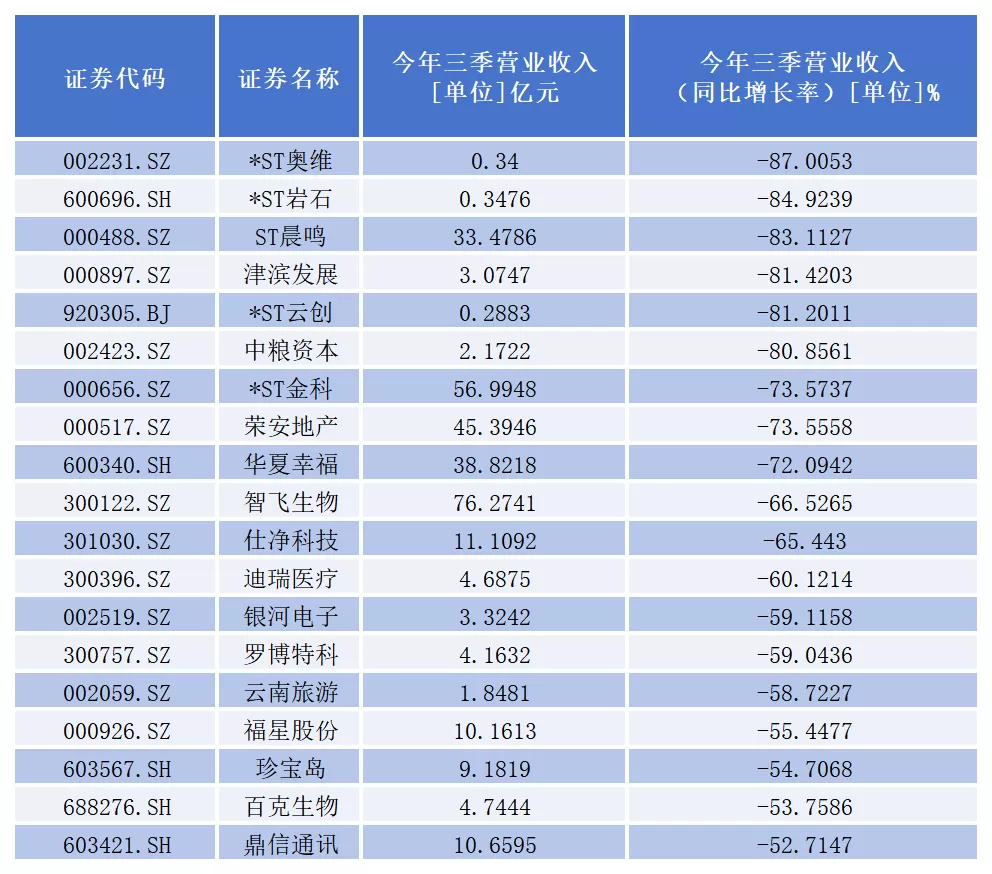 其中,*ST奥维(002231.SZ)、*ST岩石(600696.SH)、ST晨鸣(000488.SZ)、津滨发展(000897.SZ)、*ST云创(920305.BJ)、中粮资本(002423.SZ)6家公司前三季度营业收入同比暴跌超80%。