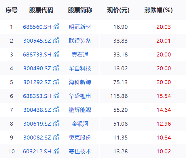 截至收盘,明冠新材(688560.SH)、联得装备(300545.SZ)、壹石通(688733.SH)、华自科技(300490.SZ)、海科新源(301292.SZ)、赛伍技术(603212.SH)、国晟科技(603778.SH)、道明光学(002632.SZ)、维科技术(600152.SH)等多股涨停,华盛锂电(688353.SH)、鹏辉能源(300438.SZ)、金银河(300619.SZ)、奥克股份(300082.SZ)涨超10%。