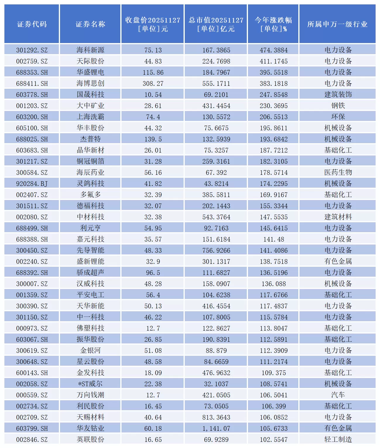 海科新源、天际股份、华盛锂电、海博思创、国晟科技、大中矿业、上海洗霸、华丰股份、杰普特、晶华新材、铜冠铜箔、海辰药业、灵鸽科技、多氟多、德福科技、中材科技、利元亨、嘉元科技、先导智能、盛新锂能、骄成超声、汉威科技、平安电工、天华新能、中一科技、佛塑科技、振华股份、金银河、星云股份、金发科技、*ST威尔、万向钱潮、利民股份、天赐材料、华友钴业、英联股份等36家上市公司年内股价已经成功实现翻倍。