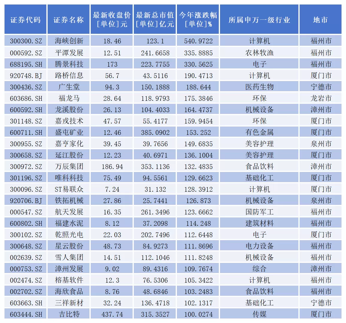 从二级市场表现看,截至12月收盘,今年以来,已有25家上市公司年内股价成功实现翻倍。具体包括:海峡创新、平潭发展、腾景科技、路桥信息、广生堂、福龙马、龙溪股份、嘉戎技术、盛屯矿业、嘉亨家化、延江股份、万辰集团、唯科科技、ST易联众、铁拓机械、航天发展、福建水泥、乾照光电、星云股份、雪人集团、漳州发展、榕基软件、海欣食品、三祥新材、吉比特。