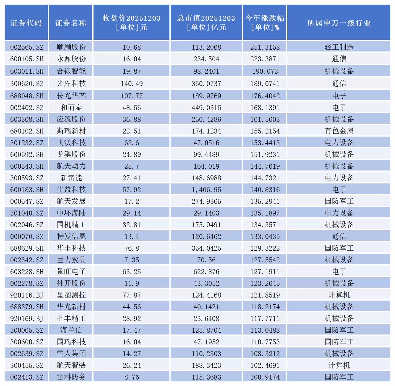 顺灏股份、永鼎股份、合锻智能、光库科技、长光华芯、和而泰、应流股份、斯瑞新材、飞沃科技、龙溪股份、航天动力、新雷能、生益科技、航天发展、中环海陆、国机精工、特发信息、华丰科技、巨力索具、景旺电子、神开股份、星图测控、华光新材、七丰精工、海兰信、国瑞科技、雪人集团、航天智装、雷科防务等29家公司年内股价成功实现翻倍。