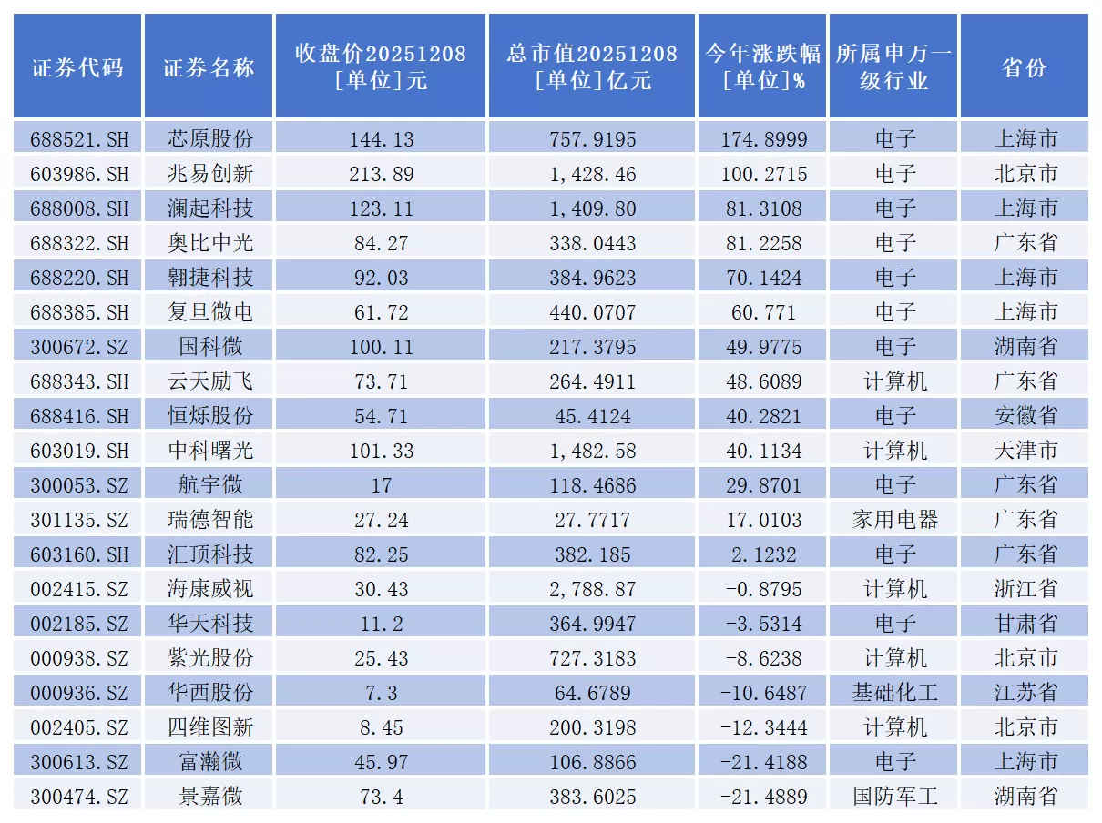 从二级市场表现看,截至12月8日收盘,今年以来,芯原股份(688521.SH)、兆易创新(603986.SH)、澜起科技(688008.SH)、奥比中光(688322.SH)、翱捷科技(688220.SH)、复旦微电(688385.SH)等6家公司年内涨幅均超过50%。