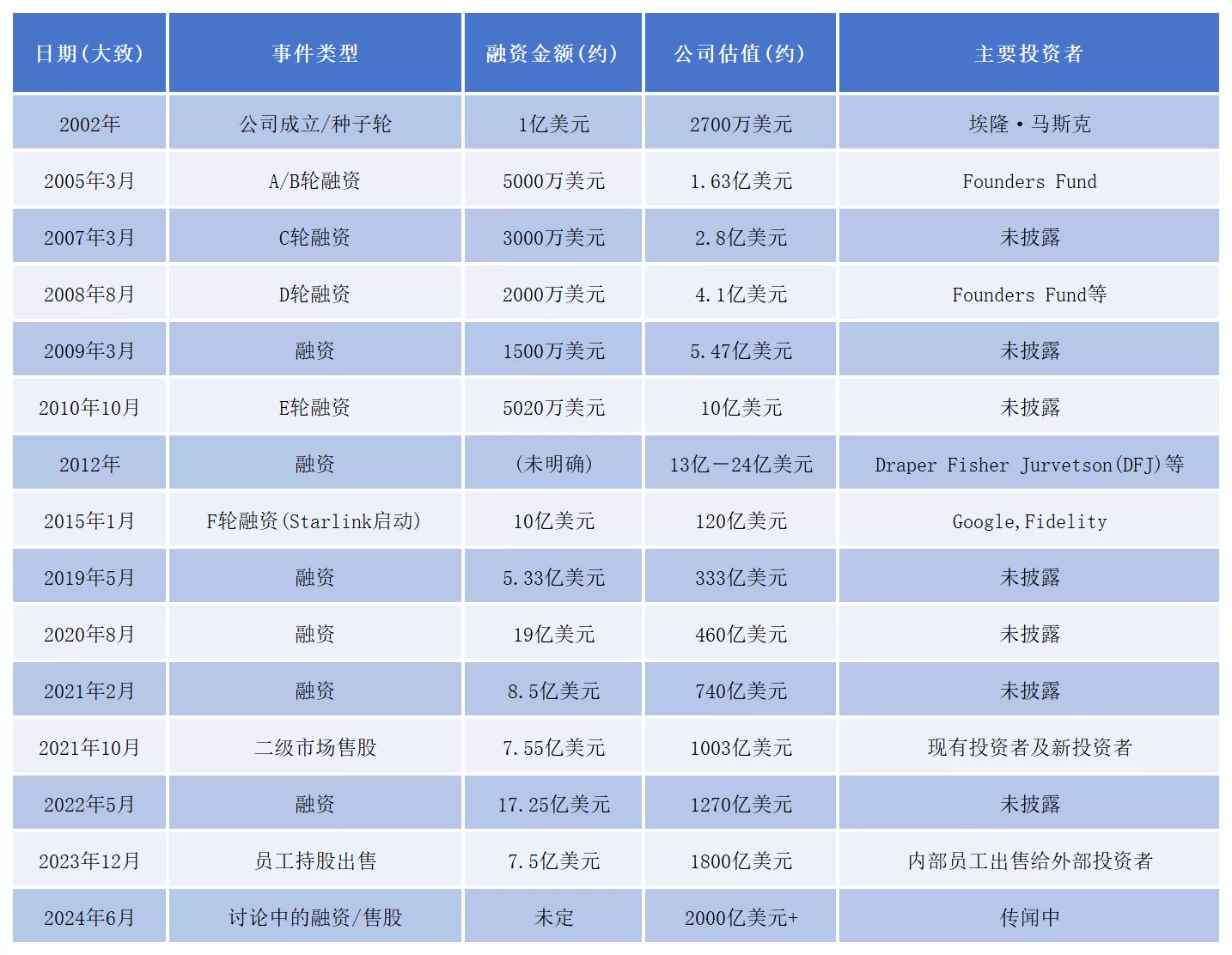 SpaceX的市场估值也水涨船高,从当初2700万美元的估值跃升为近2000亿美元的科技巨头,在二十多年间实现了近7400倍的增长。