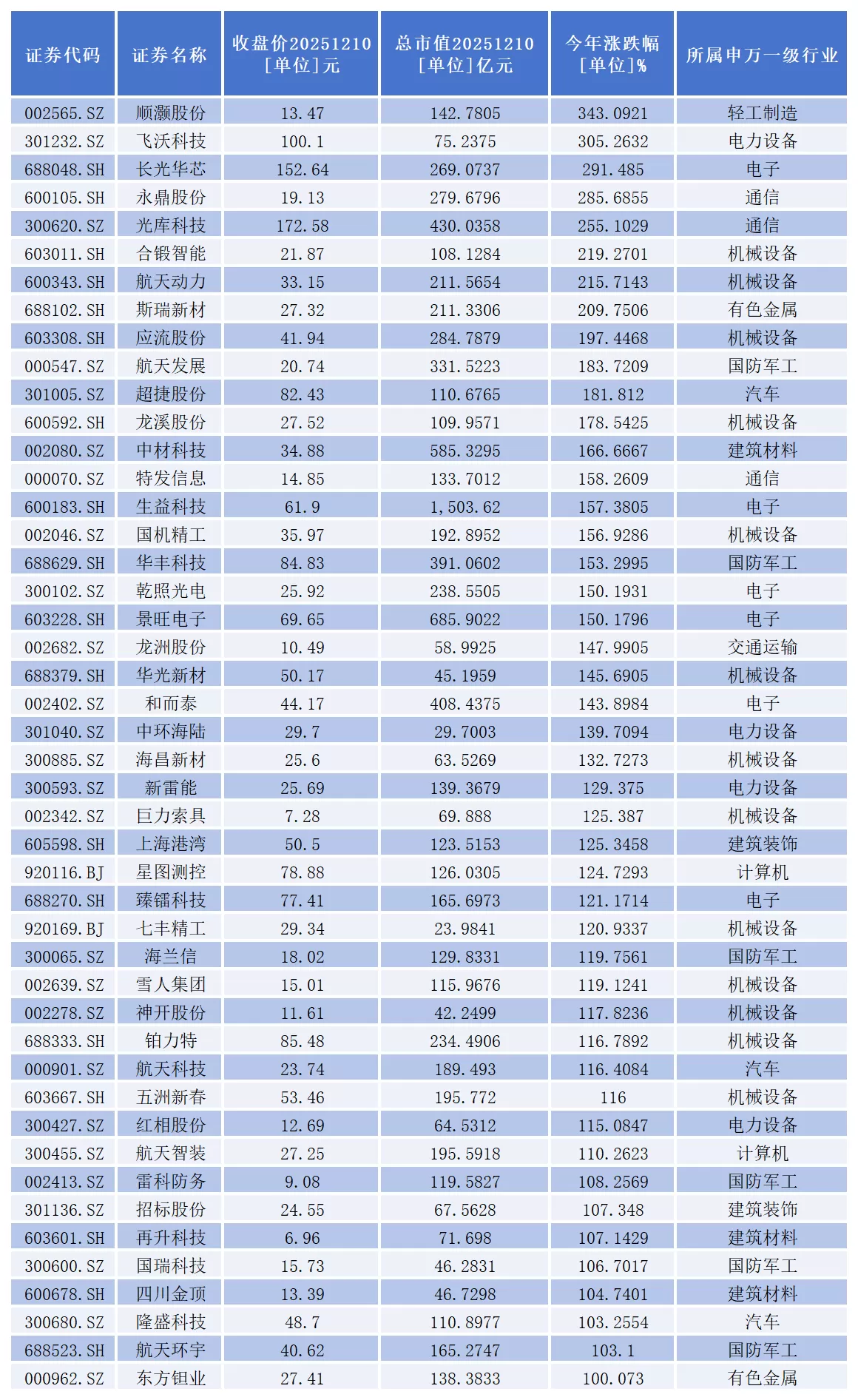 顺灏股份、飞沃科技、长光华芯、永鼎股份、光库科技、合锻智能、航天动力、斯瑞新材8家公司涨幅超过200%。
