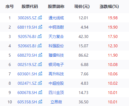 通光线缆触及涨停板。公司主营光纤光缆、输电线缆、装备线缆三大板块,OPGW等电力光缆产品市场占有率连续多年位居前列,服务国家电网、南方电网、通信运营商及航天科技集团等核心客户。公司航空导线、应力转移型节能导线等被工信部认定为单项冠军产品,航空航天用耐高温电缆为军方产品的五家国内供应商之一。