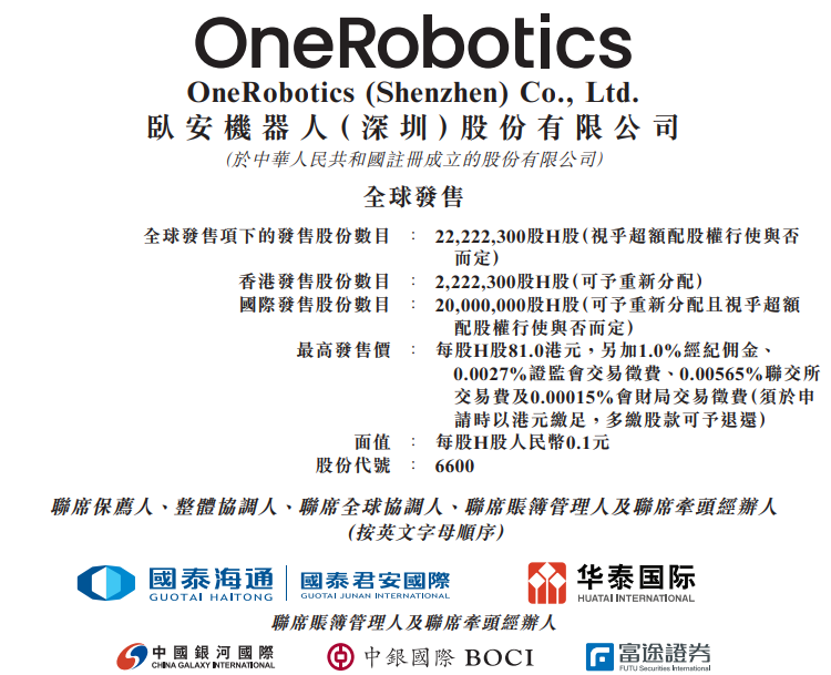 卧安机器人(06600.HK):H股每股发售价介于63港元至81港元