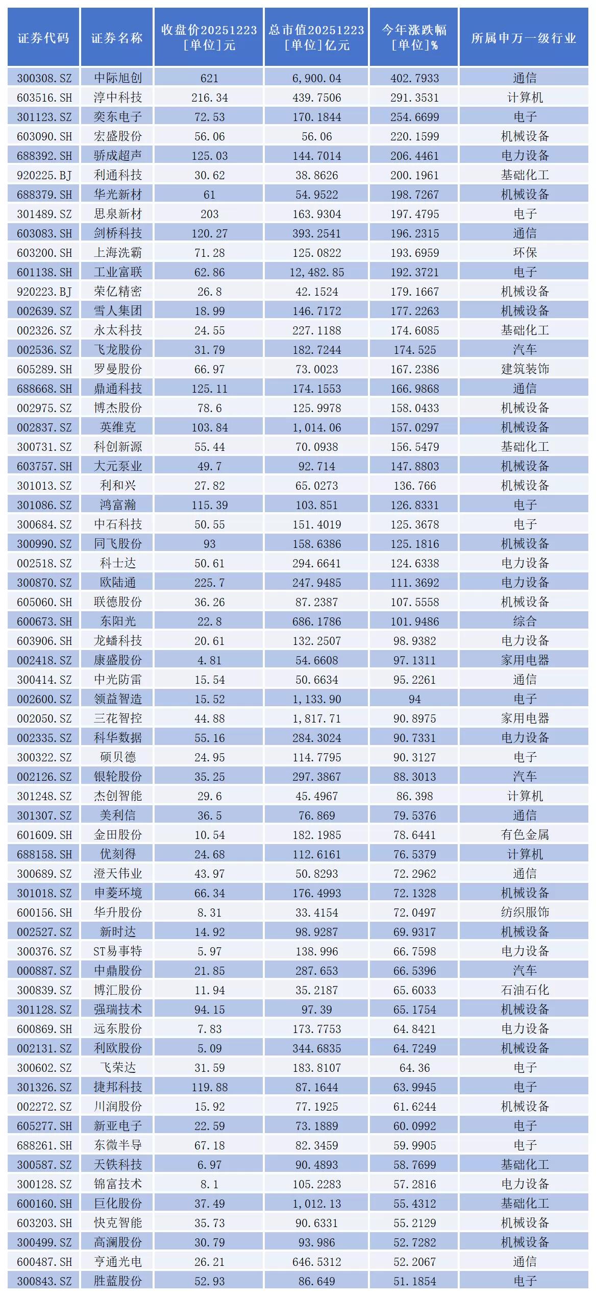 同花顺数据显示,目前,A股液冷服务器概念一共有170家上市公司。从二级市场表现看,截至12月23日收盘,今年以来,股价涨幅超过50%的有63家,其中,29家成功实现翻倍,具体包括: