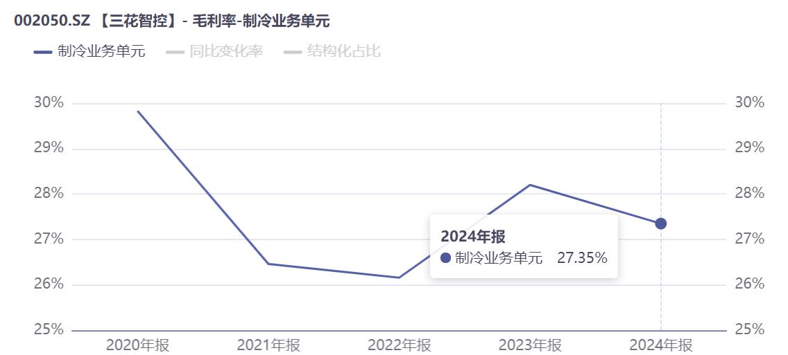 2020-2024年,公司制冷业务复合增长率为14.5%,保持稳健增长。毛利率方面,始终保持在25%-30%的较高水平,高于竞争对手。